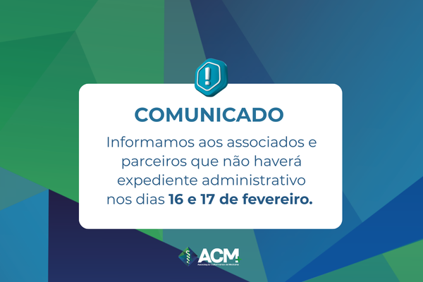 Informamos aos associados e parceiros que não haverá expediente administrativo na ACM nos dias 16 e 17 de fevereiro. Retornaremos no dia 18 de fevereiro,